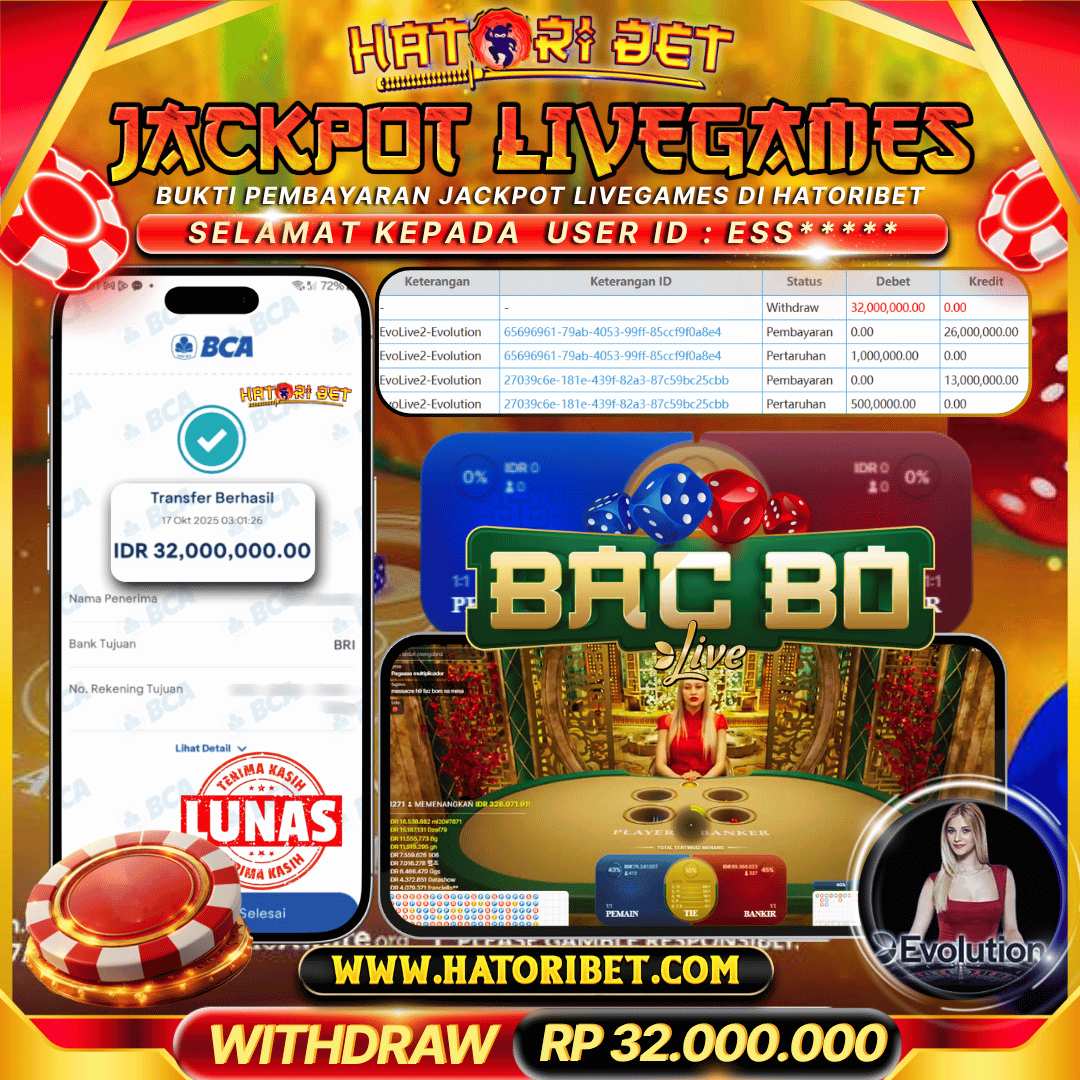 HATORIBET JACKPOT LIVEGAMES EVOLUTION LIVE-BAC BO RP 32,000,000 ,- LUNAS