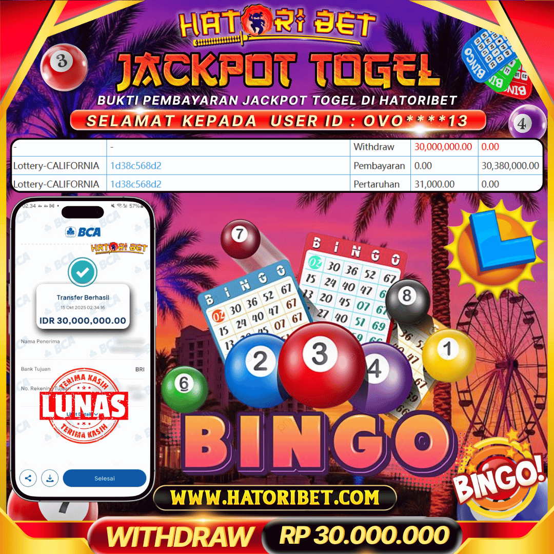 HATORIBET JACKPOT TOGEL-CALIFORNIA RP 30,000,000 ,- LUNAS