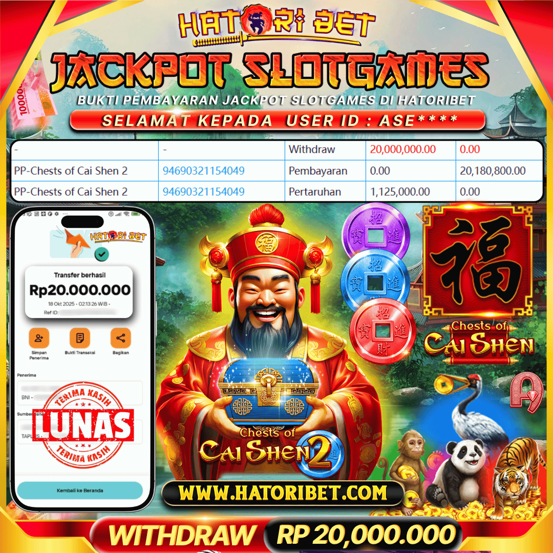 HATORIBET JACKPOT SLOTGAMES PP-CHESTS OF CAI SHEN 2 20,000,000 ,- LUNAS