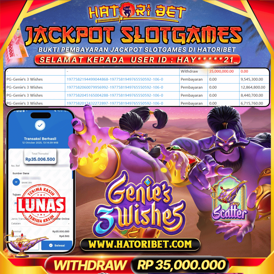 HATORIBET JACKPOT SLOTGAMES PG-GENIE'S 3 WISHES 30,000,000 ,- LUNAS