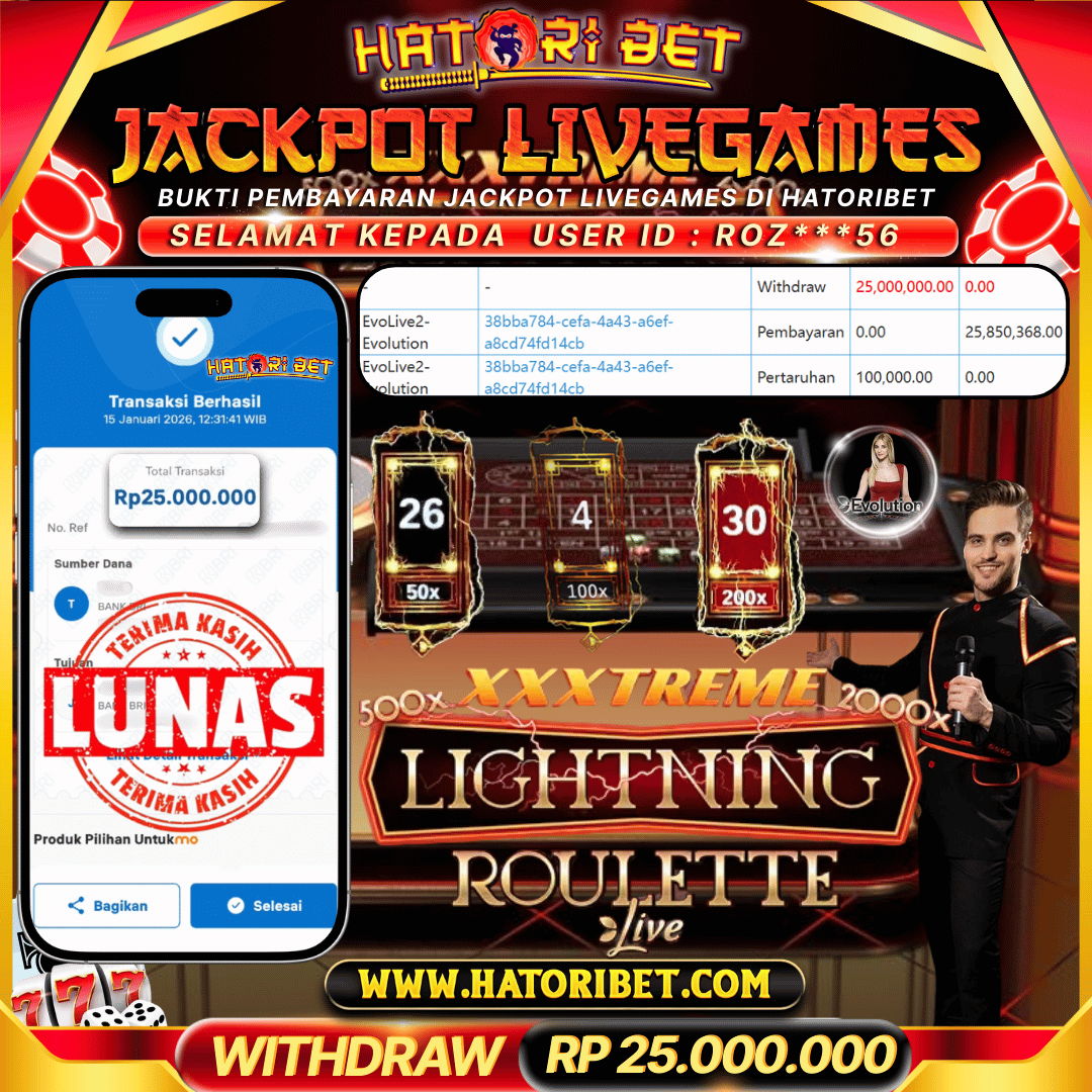 Selamat kepada UserId : ROZ***56 telah berhasil mendapatkan kemenangan besar pada permainan LIVEGAMES EVOLUTION-XXXTREME LIGHTNING ROULETTE kemenangan sebesar RP 25,000,000, Setelah mengisi formulir withdraw dalam kurung waktu hanya 5 – 10 menit pihak HatoriBet sudah melakukan transfer kepada pemilik UserId dan dana sudah dapat di cairkan oleh pemenang. Bukti pembayaran yang kami berikan merupakan bukti pembayaran yang SAH / VALID yang langsung di dapatkan melaui tanda transfer transaksi dari Bank yang di tuju. Kami mengucapakan banyak Terima Kasih Kepada pemenang karena sudah mempercayakan kami sebagai Bandar terpercaya yang membayar semua kemenangan member hingga lunas. Masih ragu dengan HatoriBet? Di mana bandar slot dan togel online sekarang yang terpercaya seperti hatoribet ? Bandar yang mengirimkan kemenangan member tanpa bertele – tele. Jadi.... tidak perlu khawatir pada situs HATORIBET karena kemenangan berapapun akan dibayarakan hingga lunas kepada pemenang.