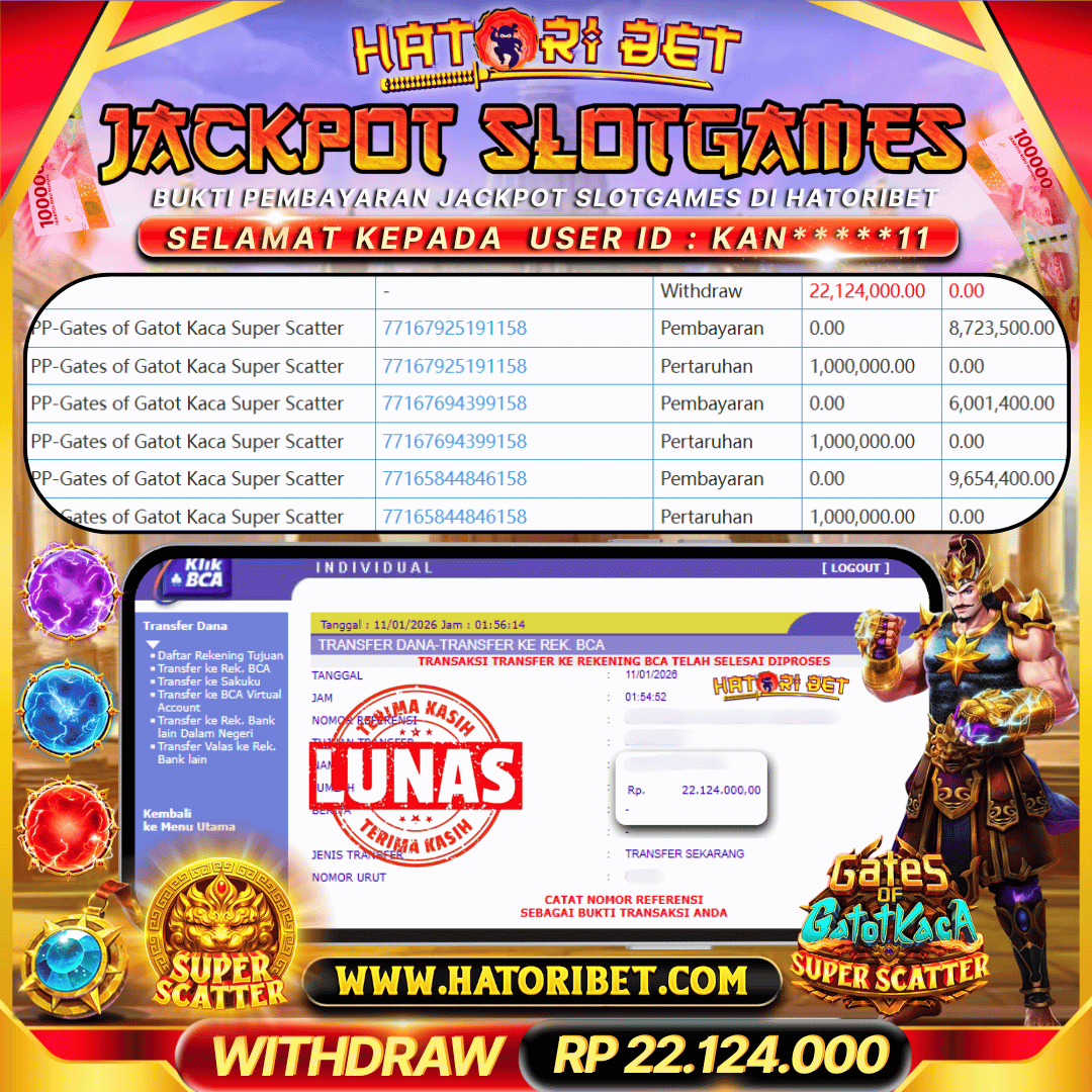 Selamat kepada UserId : KAN*****11 telah berhasil mendapatkan kemenangan besar pada permainan SLOTGAMES PP-GATES OF GATOT KACA SUPER SCATTER RP 22,124,000 , Setelah mengisi formulir withdraw dalam kurung waktu hanya 5 – 10 menit pihak HatoriBet sudah melakukan transfer kepada pemilik UserId dan dana sudah dapat di cairkan oleh pemenang. Bukti pembayaran yang kami berikan merupakan bukti pembayaran yang SAH / VALID yang langsung di dapatkan melaui tanda transfer transaksi dari Bank yang di tuju. Kami mengucapakan banyak Terima Kasih Kepada pemenang karena sudah mempercayakan kami sebagai Bandar terpercaya yang membayar semua kemenangan member hingga lunas. Masih ragu dengan HatoriBet? Di mana bandar slot dan togel online sekarang yang terpercaya seperti hatoribet ? Bandar yang mengirimkan kemenangan member tanpa bertele – tele. Jadi.... tidak perlu khawatir pada situs HATORIBET karena kemenangan berapapun akan dibayarkan hingga lunas