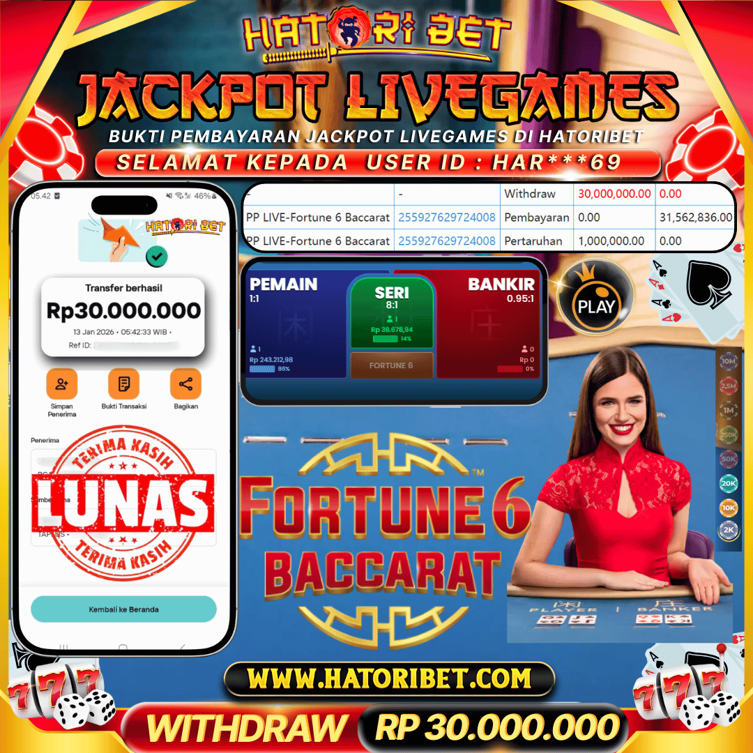 HATORIBET JACKPOT LIVEGAMES PP LIVE-FORTUNE 6 BACCARAT RP 30,000,000 ,- LUNAS
