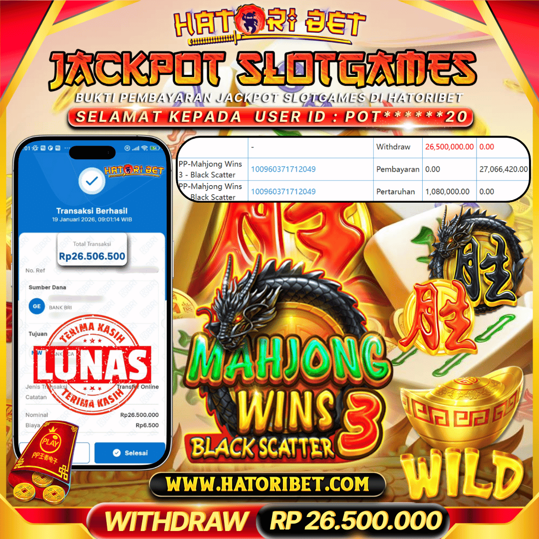 Selamat kepada UserId : POT******20 telah berhasil mendapatkan kemenangan besar pada permainan SLOTGAMES PP-MAHJONG WINS BLACK SCATTER 3 sebesar RP 26,500,000 , Setelah mengisi formulir withdraw dalam kurung waktu hanya 5 – 10 menit pihak HatoriBet sudah melakukan transfer kepada pemilik UserId dan dana sudah dapat di cairkan oleh pemenang. Bukti pembayaran yang kami berikan merupakan bukti pembayaran yang SAH / VALID yang langsung di dapatkan melaui tanda transfer transaksi dari Bank yang di tuju. Kami mengucapakan banyak Terima Kasih Kepada pemenang karena sudah mempercayakan kami sebagai Bandar terpercaya yang membayar semua kemenangan member hingga lunas. Masih ragu dengan HatoriBet? Di mana bandar slot dan togel online sekarang yang terpercaya seperti hatoribet ? Bandar yang mengirimkan kemenangan member tanpa bertele – tele. Jadi.... tidak perlu khawatir pada situs HATORIBET karena kemenangan berapapun akan dibayarkan hingga lunas kepada pemenang