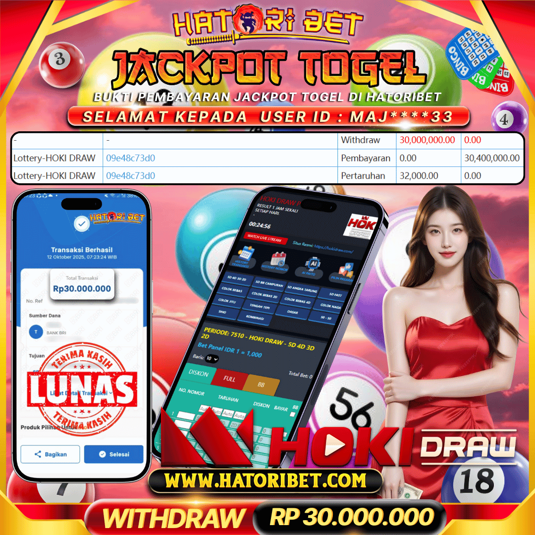HATORIBET JACKPOT TOGEL HOKI DRAW RP 30,000,000 ,- LUNAS