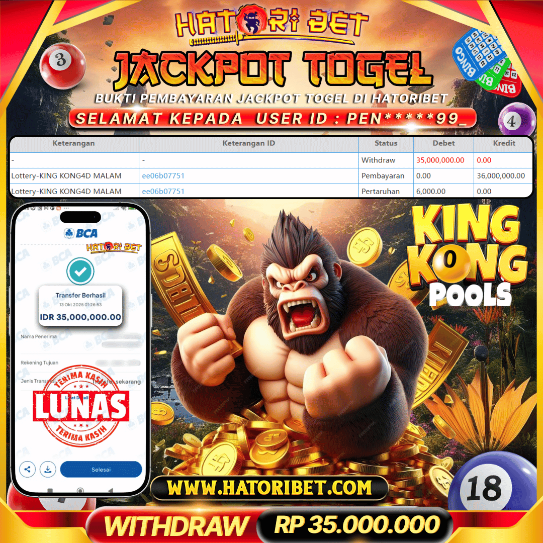 HATORIBET JACKPOT TOGEL KINGKONG 4D RP 35,000,000 ,- LUNAS