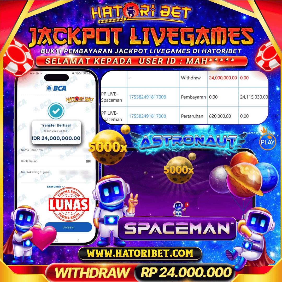 HATORIBET JACKPOT LIVEGAMES PP LIVE-SPACEMAN RP 24,000,000 ,- LUNAS