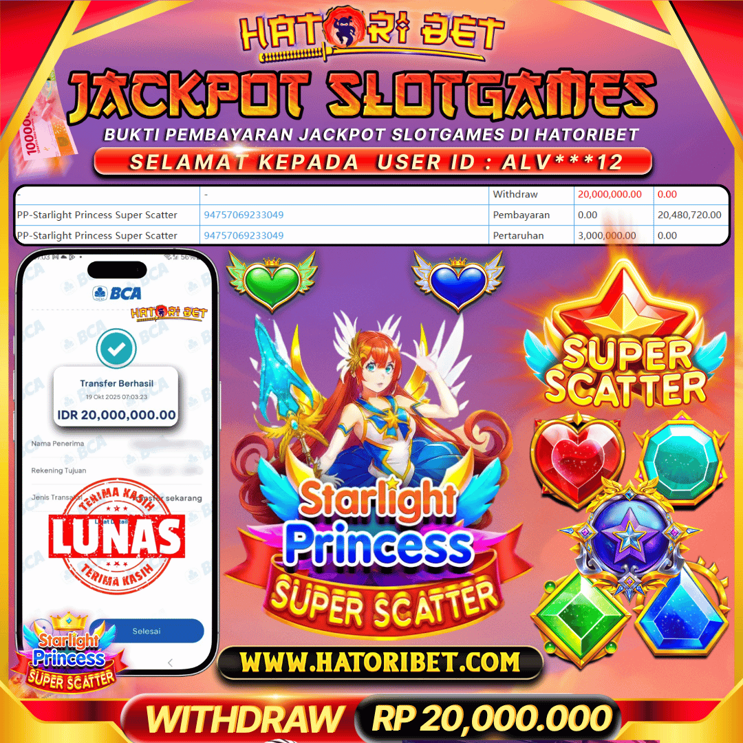Selamat kepada UserId : ALV***12 telah berhasil mendapatkan kemenangan besar pada permainan SLOTGAMES PP-STARLIGHT PRINCESS SUPER SCATTER sebesar RP 20,000,000 , Setelah mengisi formulir withdraw dalam kurung waktu hanya 5 – 10 menit pihak HatoriBet sudah melakukan transfer kepada pemilik UserId dan dana sudah dapat di cairkan oleh pemenang. Bukti pembayaran yang kami berikan merupakan bukti pembayaran yang SAH / VALID yang langsung di dapatkan melaui tanda transfer transaksi dari Bank yang di tuju. Kami mengucapakan banyak Terima Kasih Kepada pemenang karena sudah mempercayakan kami sebagai Bandar terpercaya yang membayar semua kemenangan member hingga lunas. Masih ragu dengan HatoriBet? Di mana bandar slot dan togel online sekarang yang terpercaya seperti hatoribet ? Bandar yang mengirimkan kemenangan member tanpa bertele – tele. Jadi.... tidak perlu khawatir pada situs HATORIBET karena kemenangan berapapun akan dibayarkan hingga lunas kepada pemenang.