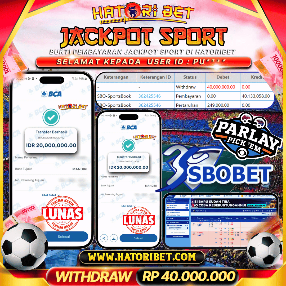 HATORIBET JACKPOT SPORT SBOBET RP 40,000,000 ,- LUNAS