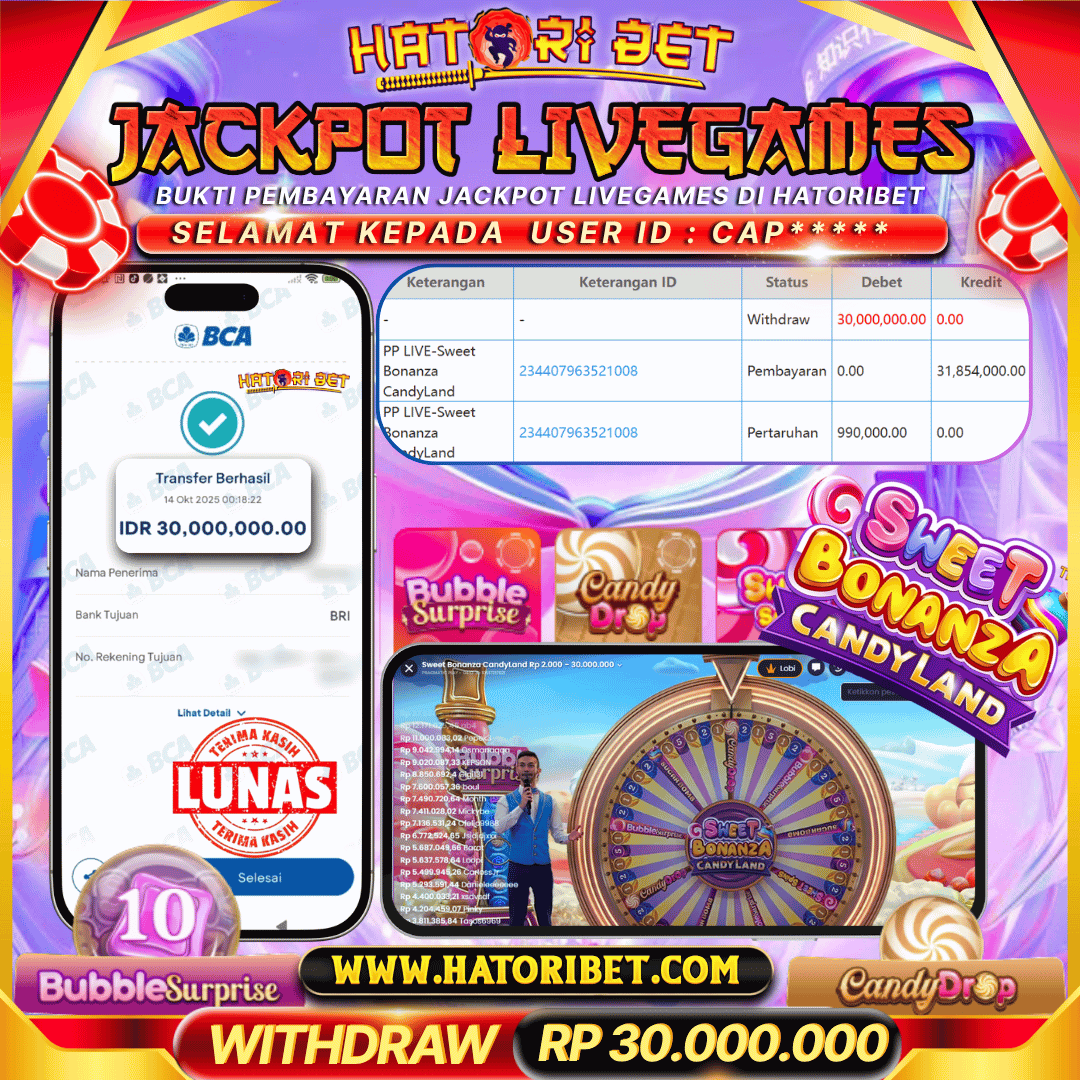HATORIBET JACKPOT LIVEGAMES PP LIVE-SWEET BONANZA CANDYLAND RP 30,000,000 ,- LUNAS