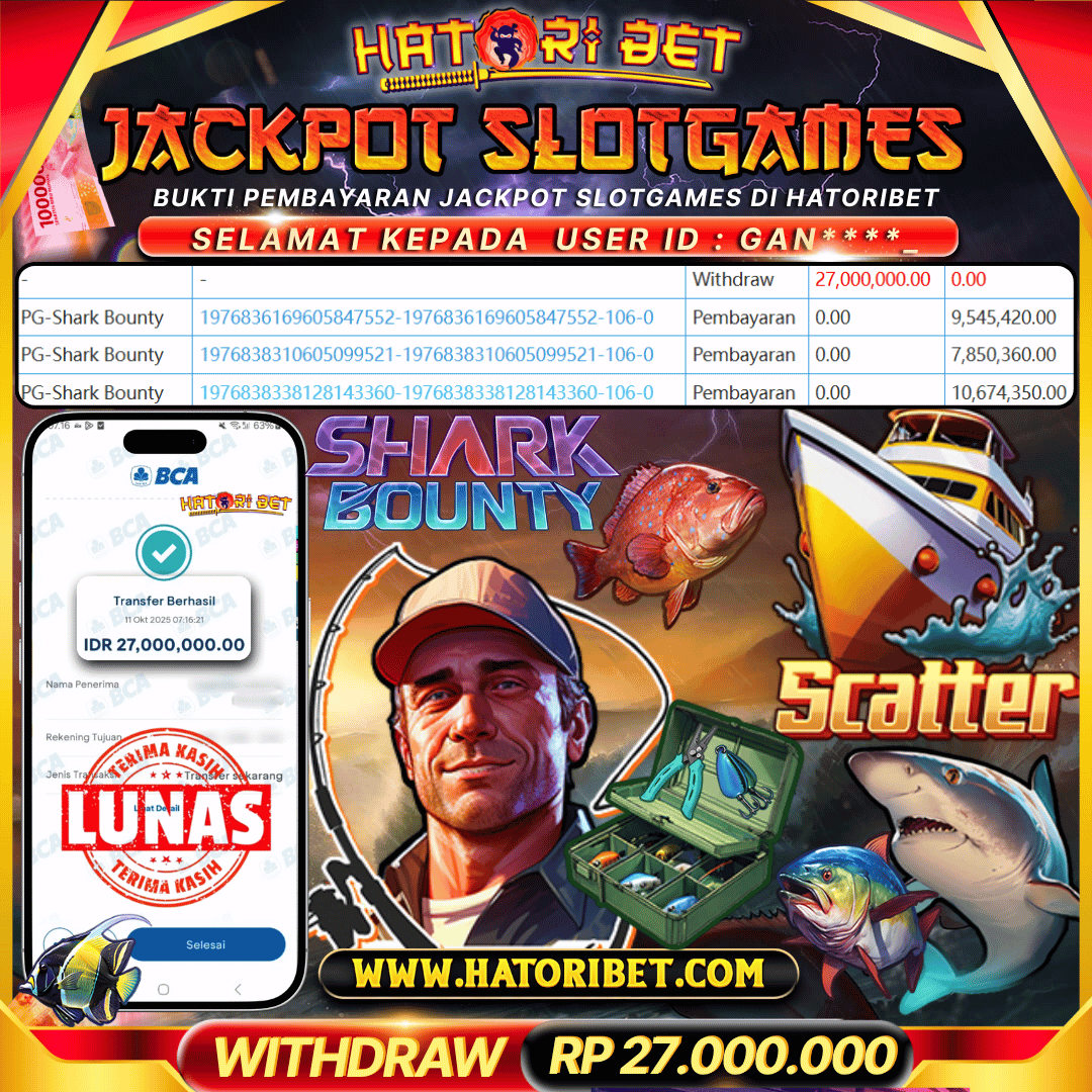 HATORIBET JACKPOT SLOTGAMES PG-SHARK BOUNTY 27,000,000 ,- LUNAS