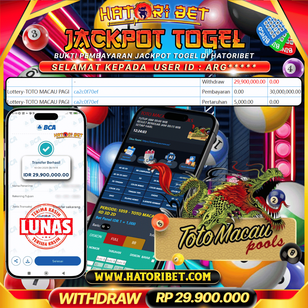 HATORIBET JACKPOT TOGEL TOTO MACAU RP 29,900,000 ,- LUNAS
