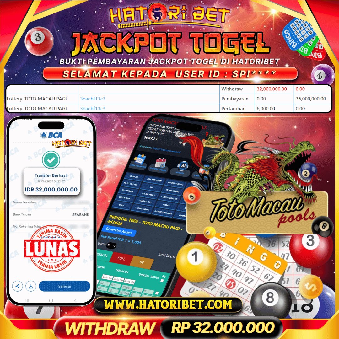 HATORIBET JACKPOT TOGEL TOTO MACAU RP 32,000,000 ,- LUNAS