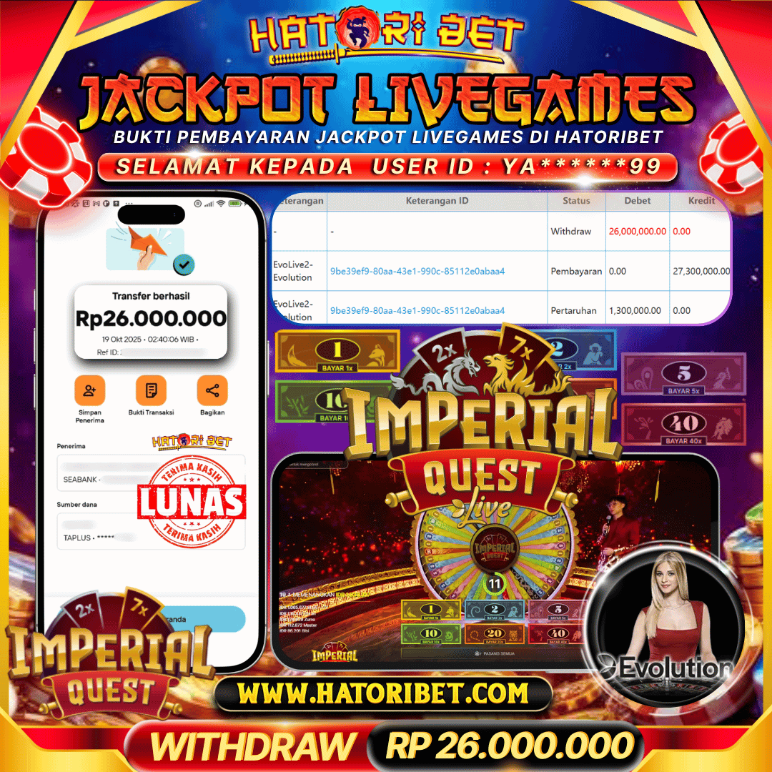 HATORIBET JACKPOT LIVEGAMES EVOLUTION LIVE-IMPERIAL QUEST RP 26,000,000 ,- LUNAS